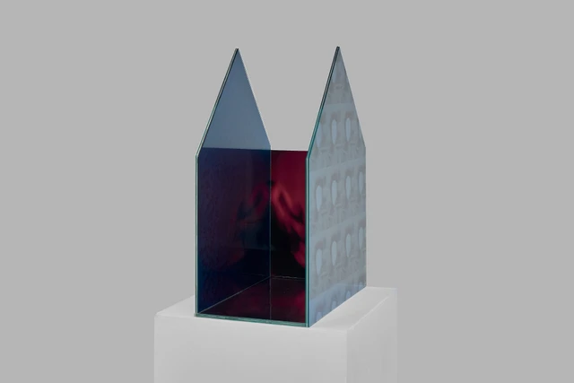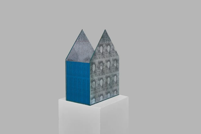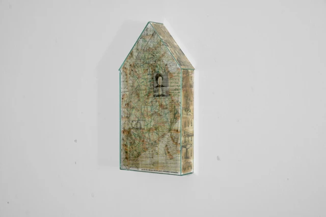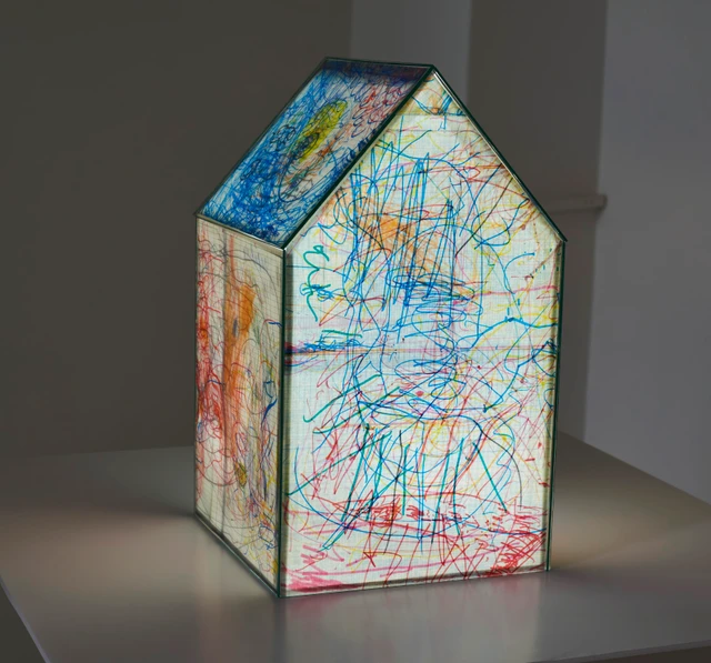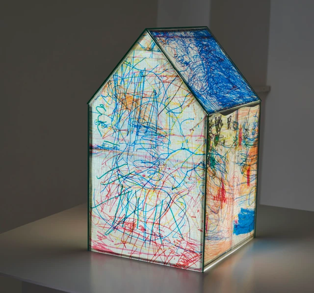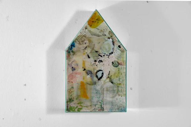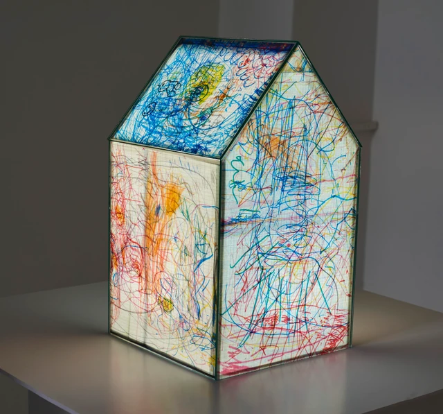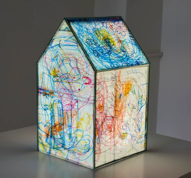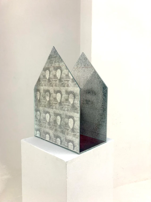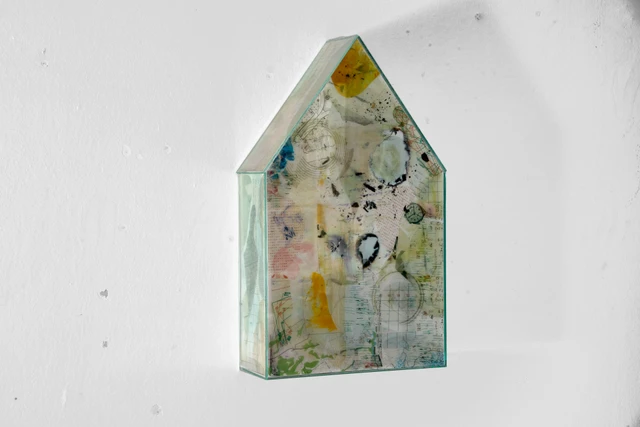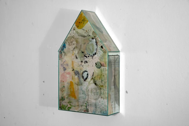 Employing mixed media, these artworks combine glass, glass mirrors, transparencies and paper, often with the addition of found objects or objects made using various kinds of clay. Some of the objects are internally illuminated or employ video projection, either projected from within or onto them from the outside, often in combination with audio installations. A house should be a place of safety. It is the delimited space where we dwell. The house is our primal universe, a place of memory. We too are the house.