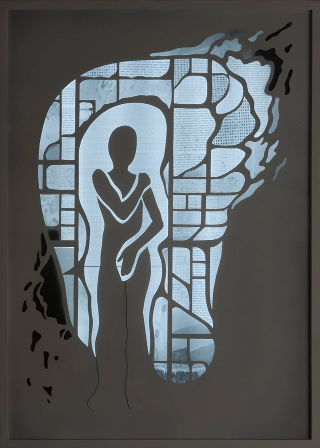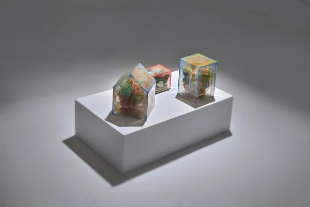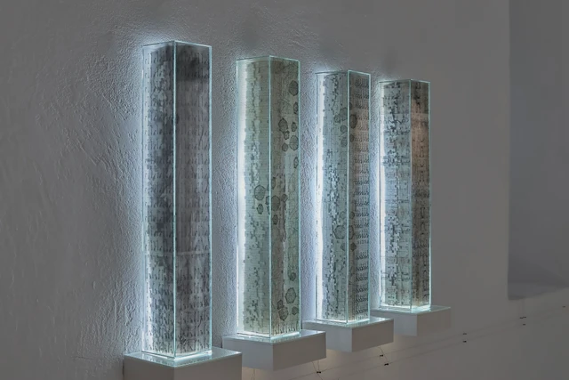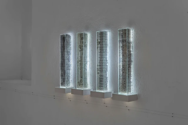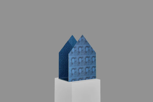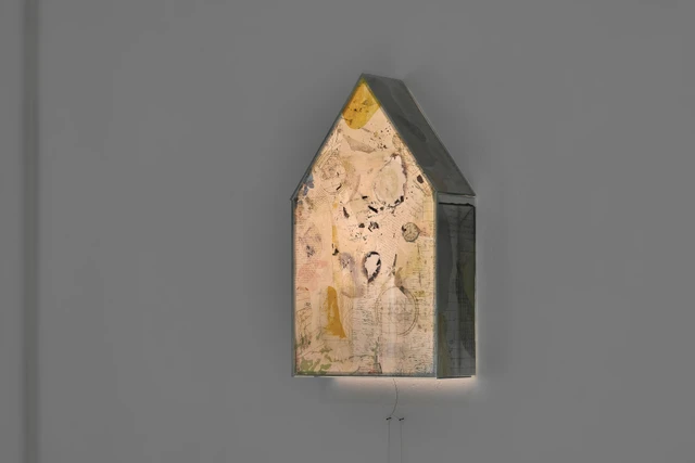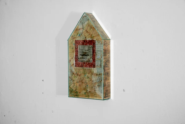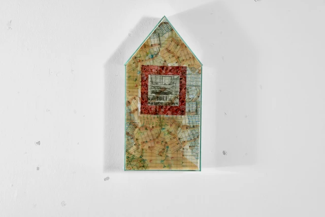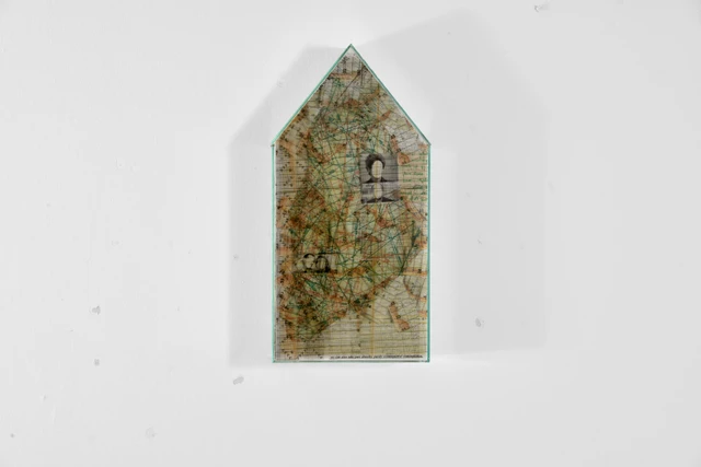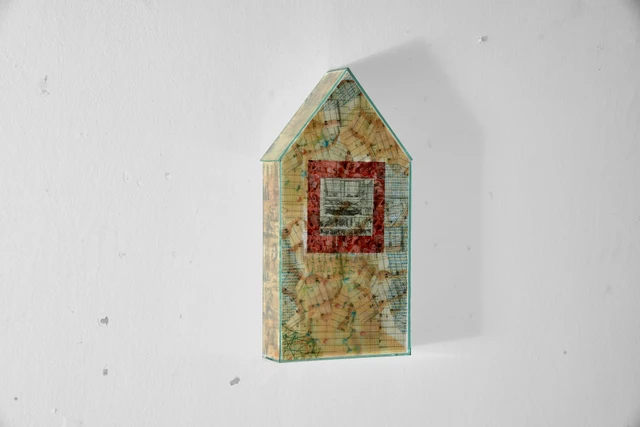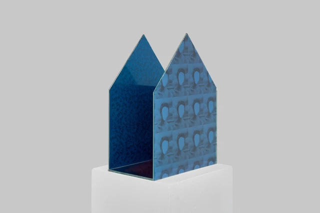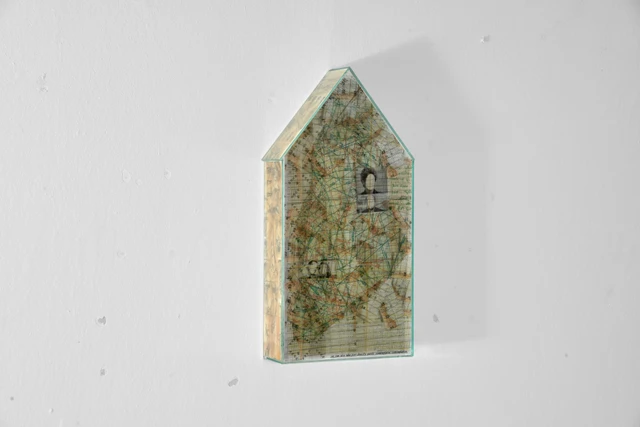 Employing mixed media, these artworks combine glass, glass mirrors, transparencies and paper, often with the addition of found objects or objects made using various kinds of clay. Some of the objects are internally illuminated or employ video projection, either projected from within or onto them from the outside, often in combination with audio installations. A house should be a place of safety. It is the delimited space where we dwell. The house is our primal universe, a place of memory. We too are the house.